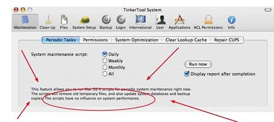 Quello che vedete in figura è la schermata iniziale che consente accesso immediato alle (da alcuni) tanto amate manutenzioni periodiche, riparazione permessi, update prebinding, ecc. ecc. (notare che lo sviluppatore specifica che non migliorano le prestazioni del system) Ma questa non è che una della miriade di interventi più o meno utili che si possono effettuare sul filesystem. A scopo puramente informativo ne cito un paio: Together with its sister program TinkerTool which is available at no charge, TinkerTool System is a perfect substitute for the following types of maintenance applications: * Cache and font cache cleaners, Il programma in realtà non è gratuito ma è possibile
