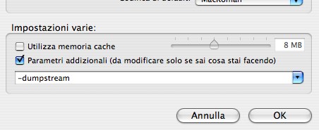 2) In MPlayer Os X: andare nelle preferenze e scrivere -dumpstream come si vede nell'immagine e poi cliccare su OK